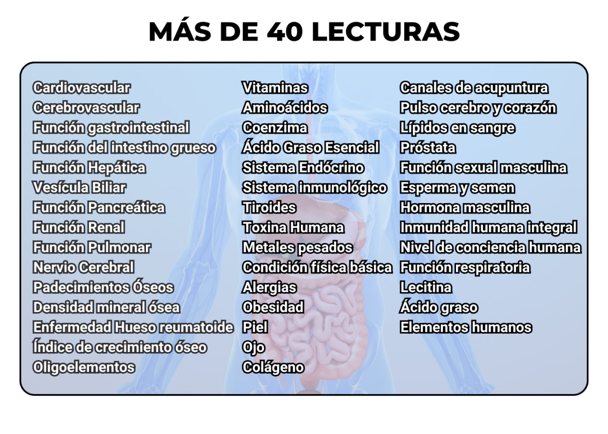 Con el análisis corporal cuántico, obtendrás un informe detallado de +40 parametros de tu cuerpo entre ellos: